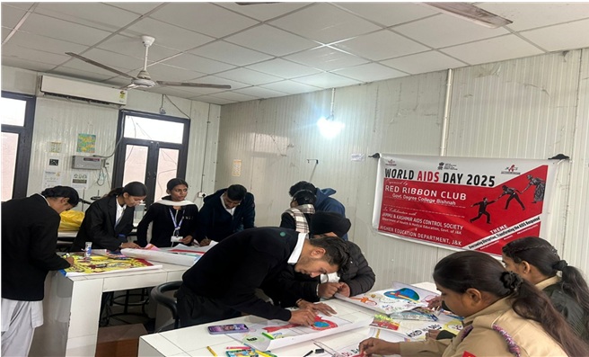 As part of the National Youth Day celebrations, the Red Ribbon Club of Government Degree College Bishnah organized a Poster Making Competition on HIV/AIDS on 18th September 2025. The event was conducted under the able supervision of the Principal of the college, Dr. Shallu Samyal. The entire program was conducted by the Nodal officers of Red Ribbon Club Dr Anshu Sawhney and Dr Ashma Gupta.
