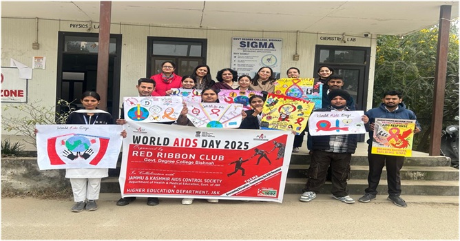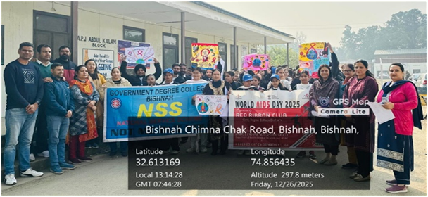 As part of the World AIDS Day celebrations, the Red Ribbon Club of Government Degree College Bishnah organized a Poster Making Competition on HIV/AIDS on 20th December 2025. The activity was organized with the objective of creating awareness among students about HIV/AIDS, its causes, preventive measures, and the social challenges faced by people living with HIV/AIDS. The event also aimed to promote empathy, inclusivity, and responsible behavior among the youth. The programme was conducted under the able supervision and guidance of the Principal of the college, Dr. Shallu Samyal, whose constant encouragement contributed to the successful organization of the event. The overall coordination and smooth execution of the activity were ensured by the Nodal Officers of the Red Ribbon Club, Dr. Anshu Sawhney and Dr. Ashma Gupta, who motivated students to participate actively and ensured disciplined conduct throughout the programme. A total of ten students from different semesters participated in the competition with great enthusiasm. Through their posters on the theme “OVERCOMING DISRUPTION, TRANSFORMING THE AIDS RESPONSE”the participants creatively expressed key messages related to the causes, modes of transmission, prevention, and social impact of HIV/AIDS. The posters served as powerful tools of visual communication, emphasizing awareness, early prevention, and the need to eliminate myths and stigma associated with the disease. The activity successfully combined artistic expression with social awareness, thereby sensitizing both participants and viewers. The competition was evaluated by a panel of judges comprising Dr. Shrotika Rajput, Head, Department of Political Science, and Dr. Koushal Kiran, Head, Department of Urdu. The judges appreciated the originality and effort of the participants and assessed the posters on the basis of creativity, clarity of message, relevance to the theme, and overall presentation. Their constructive feedback further motivated the students to engage in socially relevant creative activities. The winners of the competition were Mr. Krishan (Semester V), who secured the first position, followed by Ms. Ariba Ansari (Semester III), who achieved the second position, while the third position was bagged by Ms. Geetika Devi (Semester V). The programme concluded with motivating remarks by Dr. Anju Bala, Head, Department of Mathematics, who appreciated the initiative taken by the Red Ribbon Club in observing World AIDS Day in a meaningful manner. She emphasized the crucial role of youth in spreading awareness, promoting healthy practices, and developing a compassionate and stigma-free society. She also encouraged students to actively participate in such awareness programmes in the future. Overall, the activity proved to be successful in achieving its objectives by enhancing students’ understanding of HIV/AIDS while fostering creativity, social responsibility, and community awareness.