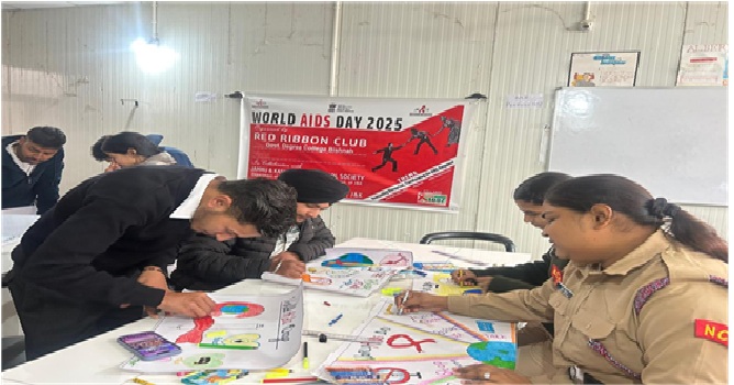 As part of the World AIDS Day celebrations, the Red Ribbon Club of Government Degree College Bishnah organized a Poster Making Competition on HIV/AIDS on 20th December 2025. The activity was organized with the objective of creating awareness among students about HIV/AIDS, its causes, preventive measures, and the social challenges faced by people living with HIV/AIDS. The event also aimed to promote empathy, inclusivity, and responsible behavior among the youth. The programme was conducted under the able supervision and guidance of the Principal of the college, Dr. Shallu Samyal, whose constant encouragement contributed to the successful organization of the event. The overall coordination and smooth execution of the activity were ensured by the Nodal Officers of the Red Ribbon Club, Dr. Anshu Sawhney and Dr. Ashma Gupta, who motivated students to participate actively and ensured disciplined conduct throughout the programme. A total of ten students from different semesters participated in the competition with great enthusiasm. Through their posters on the theme “OVERCOMING DISRUPTION, TRANSFORMING THE AIDS RESPONSE”the participants creatively expressed key messages related to the causes, modes of transmission, prevention, and social impact of HIV/AIDS. The posters served as powerful tools of visual communication, emphasizing awareness, early prevention, and the need to eliminate myths and stigma associated with the disease. The activity successfully combined artistic expression with social awareness, thereby sensitizing both participants and viewers. The competition was evaluated by a panel of judges comprising Dr. Shrotika Rajput, Head, Department of Political Science, and Dr. Koushal Kiran, Head, Department of Urdu. The judges appreciated the originality and effort of the participants and assessed the posters on the basis of creativity, clarity of message, relevance to the theme, and overall presentation. Their constructive feedback further motivated the students to engage in socially relevant creative activities. The winners of the competition were Mr. Krishan (Semester V), who secured the first position, followed by Ms. Ariba Ansari (Semester III), who achieved the second position, while the third position was bagged by Ms. Geetika Devi (Semester V). The programme concluded with motivating remarks by Dr. Anju Bala, Head, Department of Mathematics, who appreciated the initiative taken by the Red Ribbon Club in observing World AIDS Day in a meaningful manner. She emphasized the crucial role of youth in spreading awareness, promoting healthy practices, and developing a compassionate and stigma-free society. She also encouraged students to actively participate in such awareness programmes in the future. Overall, the activity proved to be successful in achieving its objectives by enhancing students’ understanding of HIV/AIDS while fostering creativity, social responsibility, and community awareness.